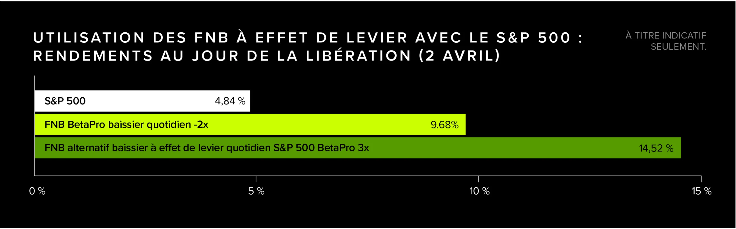 Par exemple, si vous déteniez un FNB inversé le 2 avril, jour où les États-Unis ont imposé pour la première fois des droits de douane réciproques à la plupart de leurs principaux partenaires commerciaux, vous auriez réalisé un gain d’environ 4,84 %, correspondant à la baisse du marché ce jour-là. Si vous déteniez le FNB BetaPro S&P 500 Baissier quotidien ‑2x, vous auriez pu réaliser un gain de 9,68 % sur cette baisse. Bien que le FNB alternatif baissier à effet de levier quotidien S&P 500 BetaPro 3x ne soit devenu accessible aux investisseurs que le 17 juin, si vous aviez pu le détenir à cette date, vous auriez réalisé un gain de 14,52 %.
