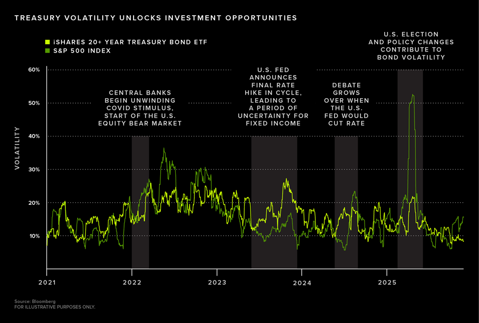 That volatility stems from duration: the longer the term – typically 20 years or more – the more sensitive a bond’s price is to changes in yield. In fact, it may surprise some to learn that treasuries can experience price swings comparable to those of major equity indexes, particularly around data releases and policy events. According to S&P Global, as of October 22, 2025, the 200-day average (the moving average based on trading days) for the VIX, the index that measures volatility of the S&P 500, was 19.34, while the 200-day average for the CBOE 20+ Yr U.S. Treasury ETF was 16.17. In other years, such as 2023, when bond yields soared, long-term treasuries were more volatile than many equity indices.